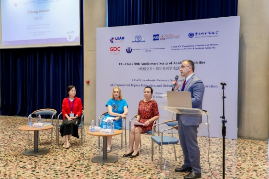 中东科技大学教授Kondakci Yasar主持闭幕式,萨格勒布大学教授Melita Kovacevic、上海大学于雪梅副校长、中丹学院王海燕院长分别进行大会总结。论坛深入探讨了在AI时代中欧双方如何共同面对机遇与挑战,进一步夯实了双方在高等教育领域的相关合作,充分展现了中欧合作的活力和潜力。