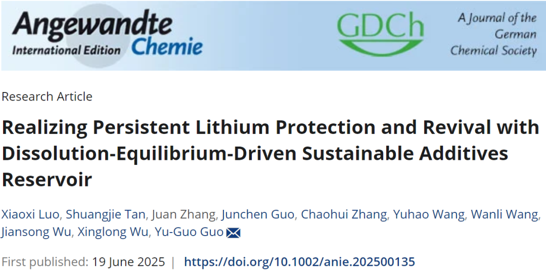2025年6月19日,中国科学院大学张娟/郭玉国、东北师范大学吴兴隆、在国际知名期刊Angewandte Chemie International Edition发表题为《Realizing Persistent Lithium Protection and Revival with Dissolution-Equilibrium-Driven Sustainable Additives Reservoir》的研究论文,Xiao-Xi Luo、Shuang-Jie Tan为论文共同第一作者,张娟、郭玉国、吴兴隆为论文共同通讯作者。