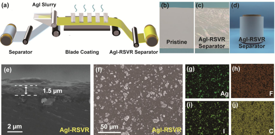 图2:a) 将“AgI储库”应用于隔膜的制备过程示意图。b-d) 显示原始隔膜和AgI-RSVR隔膜的数码图像。e) AgI-RSVR隔膜的截面扫描电子显微镜(SEM)图像。f) AgI-RSVR隔膜的SEM图像和g-j) AgI-RSVR隔膜的Ag、F、I、C元素的能谱分析图。
