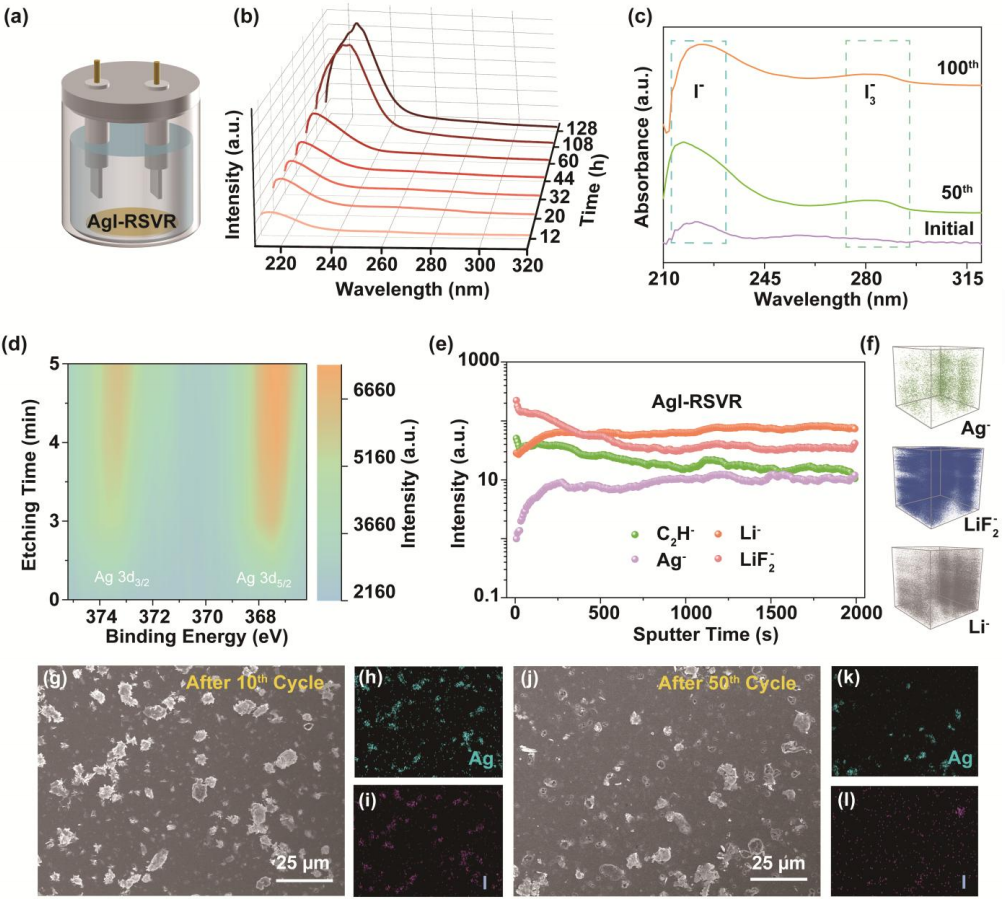 图5:a)使用AgI-RSVR隔膜的Li||Li电解槽的示意图。b)不同时间后电解槽中电解液的紫外-可见光谱(UV)。c) 不同循环次数后Li||LiNi0.6Co0.2Mn0.2O2电池中电解液的UV。d) 第50次循环后Li负极的X射线光电子能谱深度分析图,显示拟合的Ag 3d峰。e) 第50次循环后Li负极的TOM-SIMs图像和 f) Ag-、LiF2-和Li-的空间分布。AgI-RSVR隔膜在 g-i) 第10次循环和 j-l) 第50次循环后的SEM图像和Ag、I元素的能谱分析图。