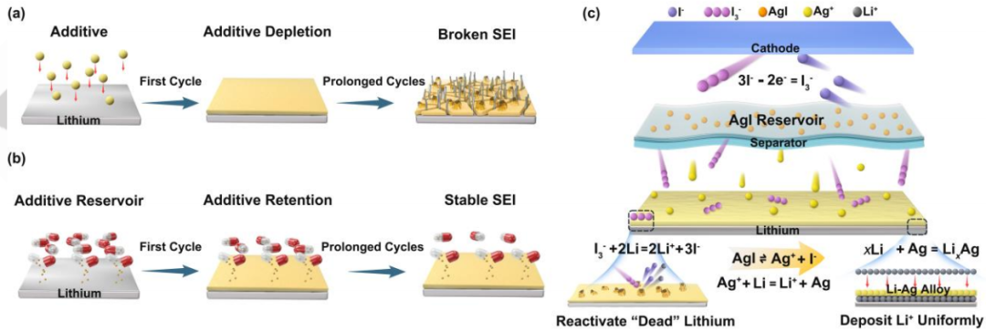 图1:a) 常规释放与b) 可持续释放添加剂在循环过程中的对比示意图。c) “AgI储库”在电池中的工作原理示意图。