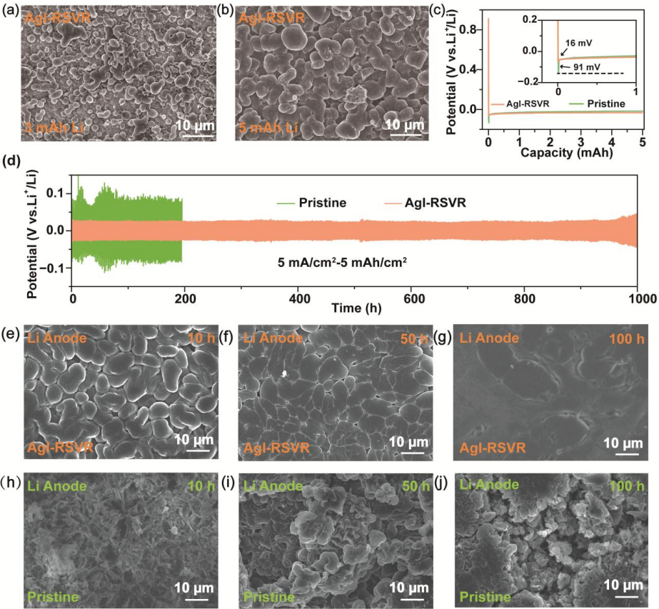 图3:a-b) 在0.5 mA/cm2下,3 mAh和5 mAh容量时Li在Cu箔上沉积的SEM图像。c) Li在0.5 mA/cm2、5 mAh条件下的电化学沉积曲线。d) 原始隔膜和AgI-RSVR隔膜的对称Li||Li电池在5 mA/cm2、5 mAh/cm2条件下的电化学性能曲线。使用AgI-RSVR隔膜e-g) 和原始隔膜h-j) 的Li负极在10、50、100h后的SEM图像。