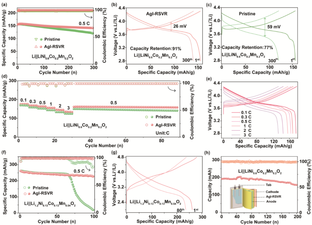 图4:原始隔膜和AgI-RSVR隔膜的全电池的电化学性能。a) Li||LiNi0.6Co0.2Mn0.2O2 电池在0.5 C下的循环性能。b-c) 不同循环次数下Li||LiNi0.6Co0.2Mn0.2O2电池的恒流充放电曲线。d) Li||LiNi0.6Co0.2Mn0.2O2电池在0.1 C到3 C的倍率性能。e) 不同倍率下使用AgI-RSVR隔膜的Li||LiNi0.6Co0.2Mn0.2O2电池的恒流充放电曲线。f) Li||Li1.21.2Ni0.13Co0.13Mn0.54O2电池的循环性能。g) 不同循环次数下使用AgI-RSVR隔膜的Li||Li1.2Ni0.13Co0.13Mn0.54O2电池的恒流充放电曲线。h) 使用AgI-RSVR隔膜的Li||LiNi0.6Co0.2Mn0.2O2软包电池在0.5 C下的循环性能。
