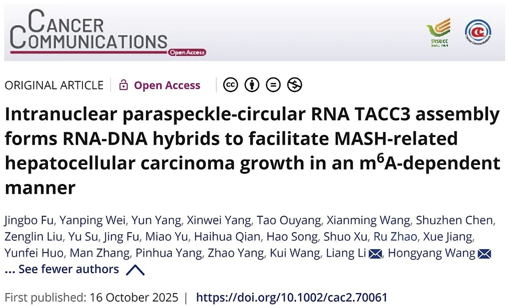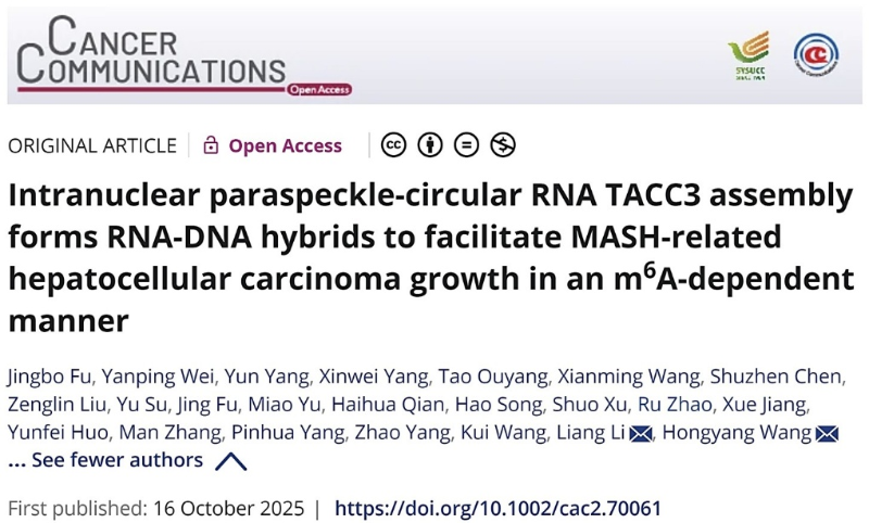 2025 年 10 月 16 日,国家肝癌科学中心、东方肝胆外科医院王红阳院士、李亮教授共同通讯,付靖波、危晏平等共同第一作者在Cancer Communications(IF=24.9)在线发表题为“Intranuclear paraspeckle-circular RNA TACC3 assemblyforms RNA-DNA hybrids to facilitateMASH-relatedhepatocellular carcinoma growth in anm6A-dependentmanner”的研究论文,发现circRNA-DNA互作失调是连接代谢应激、表观遗传修饰与MASH-HCC进展的关键分子桥梁。