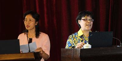 左上:高瑞平做报告 右上:曹淑敏做报告