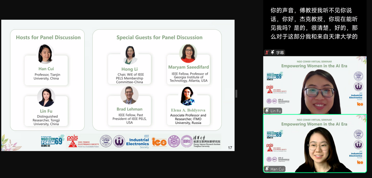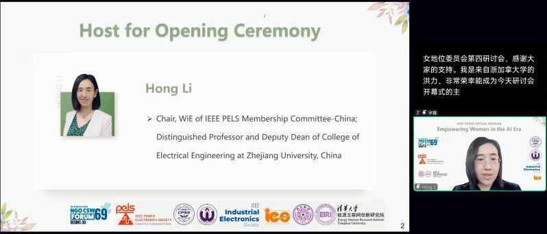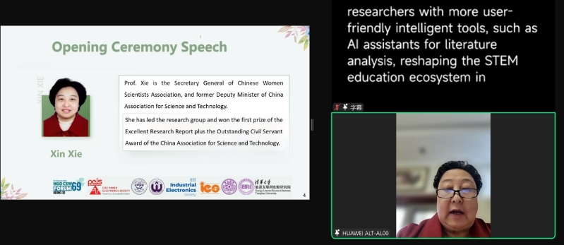 2025 年 3 月 15 日,由中国电源学会女科学家工作委员会(WiS-CPSS)和IEEE PELS 中国会员委员会-WiE subcommitte联合主办的“Empowering Women in the AI Era (AI 时代赋能女性)”线上会议成功举办。本次活动由中国女科技工作者协会、联合国女科学家与性别平等与团结协商委员会、IEEE PELS北京分会、IEEE IES北京分会和清华大学能源互联网创新研究院联合协办。会议通过ZOOM会议系统进行全程线上直播,并通过中国电源学会BiliBili平台、中国电源学会视频号和清华大学能源互联网创新研究院公众号同步转播,累计吸引4360余名观众在线观看。来自全球各地的10位特邀嘉宾齐聚云端,围绕AI时代女性发展议题展开深入探讨。 中国女科技工作者协会副会长兼秘书长解欣同志出席此次会议并致开幕词,会议由浙江大学李虹教授、杭州电子科技大学杭丽君教授、西南交通大学杨平教授、华中科技大学彭晗教授、合肥工业大学马铭遥教授、天津大学崔晗教授、同济大学付琳研究员联合主持。